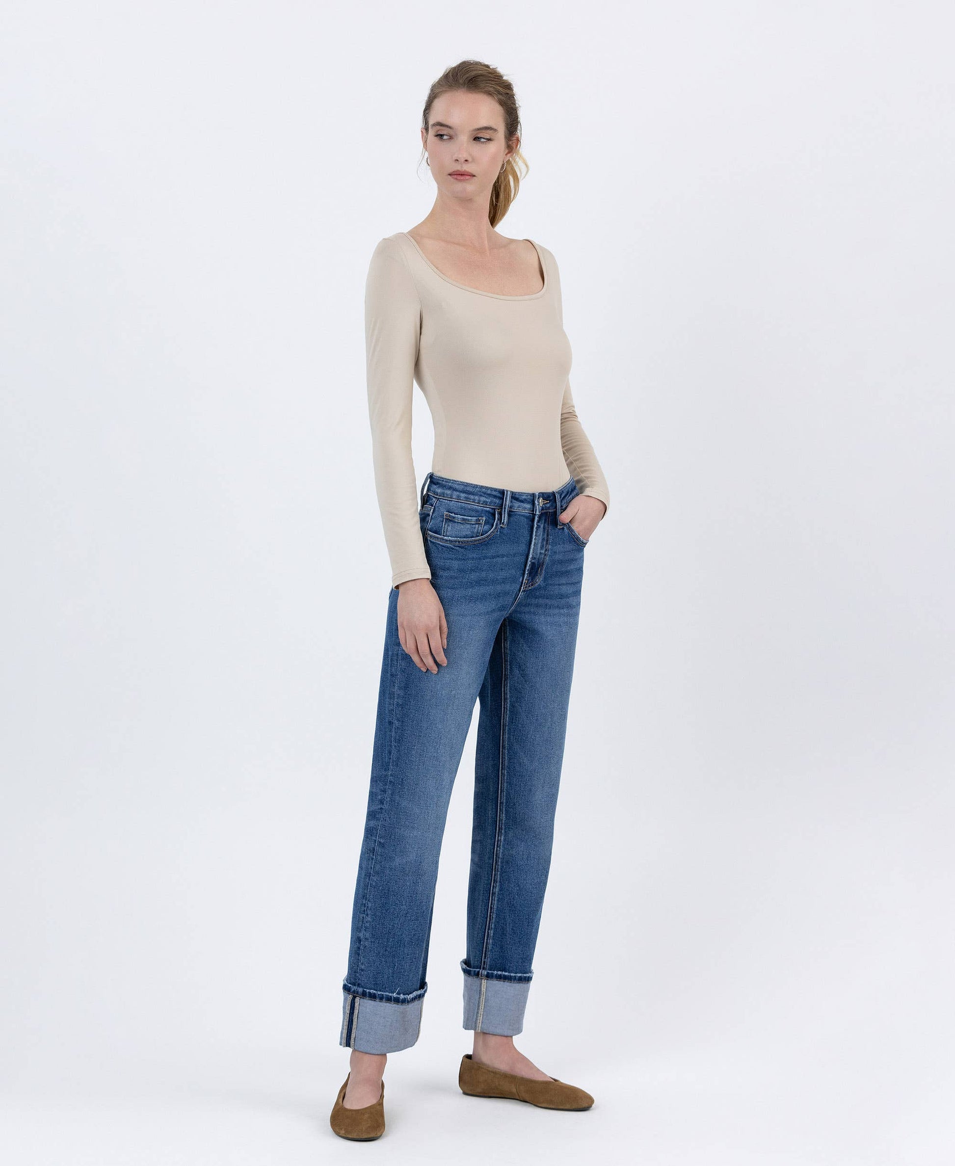 HIGH RISE CUFFED ANKLE STRAIGHT JEANS