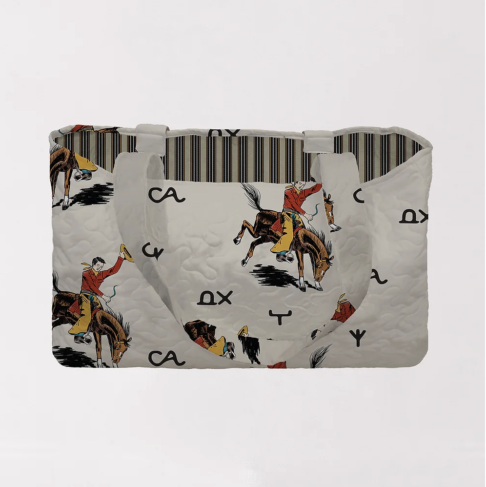 Discover our versatile and fashionable quilted tote, proudly made in Fort Worth, Texas. Crafted with care and designed for your busy life, the Lazy J Quilted Tote is not only a fashion statement but also a functional accessory. With the convenience of being machine washable on cold, it's a bag that can keep up with your everyday adventures. Explore our collection and experience the perfect blend of Texan craftsmanship and easy care. Elevate your style, and simplify your life with the Lazy J Quilted Tote.