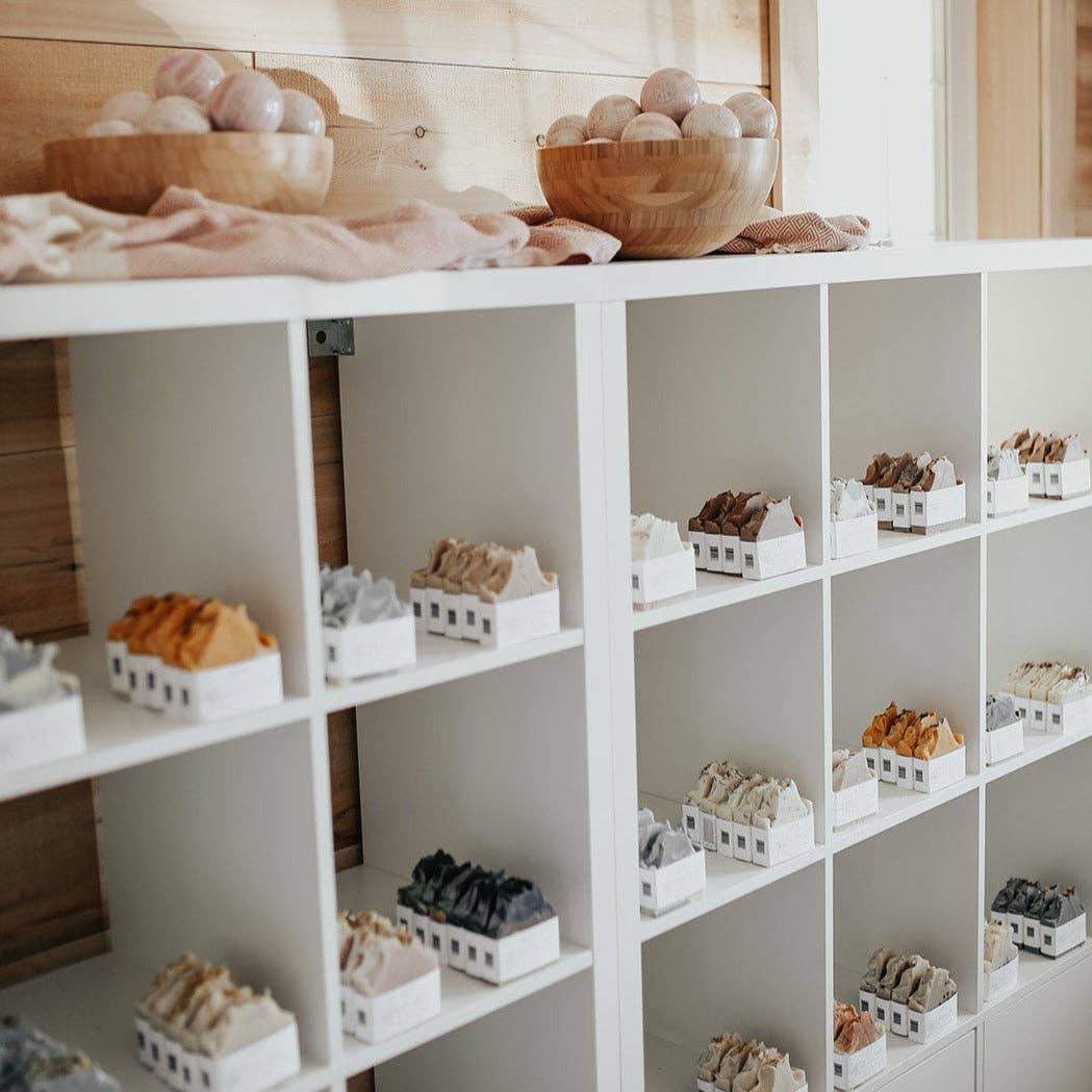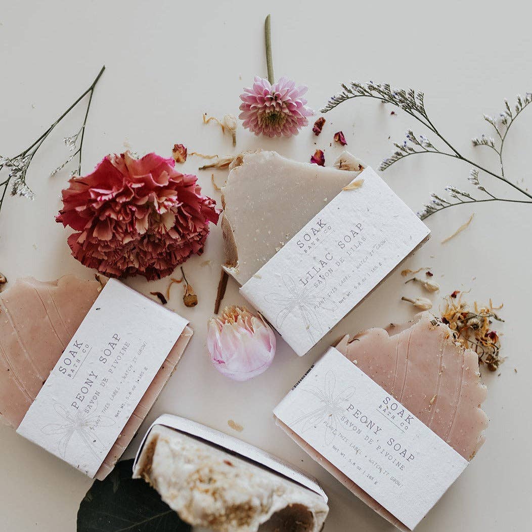 The Lilac Soap bar was designed to transport you to early spring when lilac is in bloom. Close your eyes, feel the spring time breeze against your skin and inhale. Catch a hint of that delicious lilac scent floating through the air. This bar has a beautiful lilac floral scent and is the perfect way to bring those springtime scents indoors! Our Lilac Soap bar is topped with a dusting of jasmine petals, visually recreating the lilac purple and lighter cream colours of a lilac bloom. Recommended as a body + hand soap bar. This gorgeous bar is completely zero waste and sustainable. The label on each SOAK Bath Co bar is made of biodegradable, plantable seed paper so you can plant the label and it will grow into wildflowers! Proudly Made in Canada.