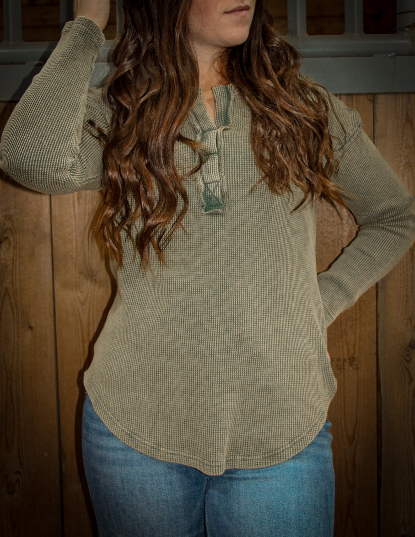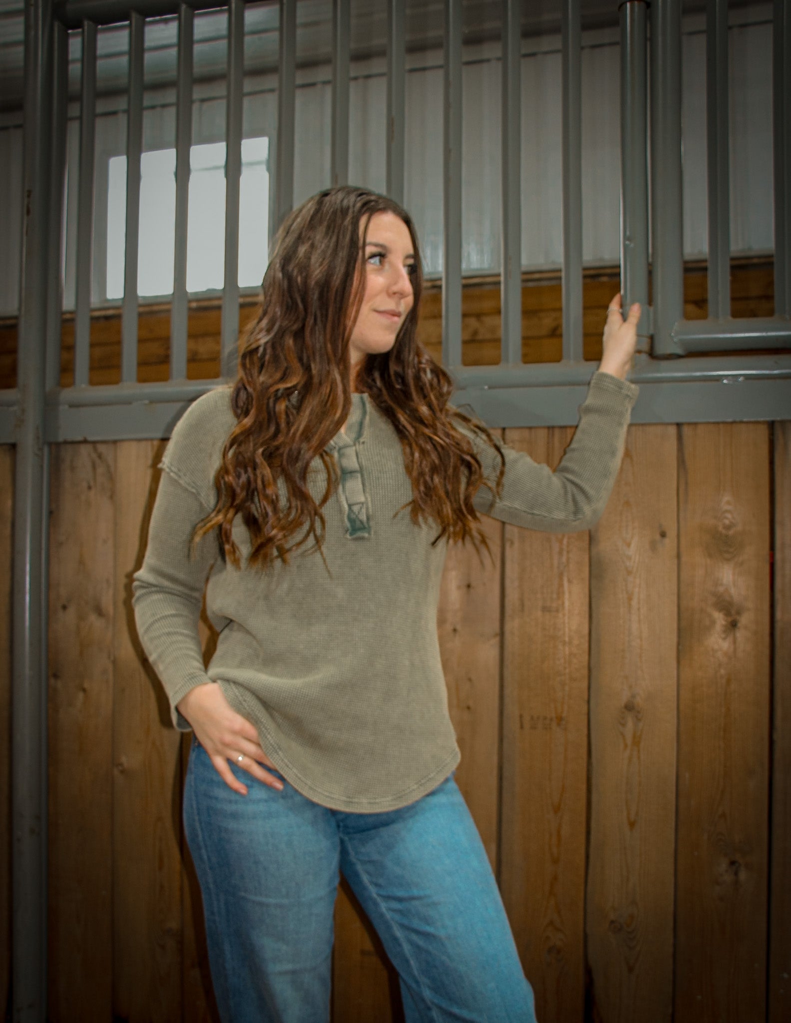 The new Mineral Washed Waffle Henley is a cold weather staple for good reason! Unique mineral washing on this long sleeve henley top makes the waffle knit detail pop, adding depth and texture to your everyday look. And for extra versatility, the casual fit keeps you comfortable with a length that’s perfect for pairing with your favorite jeans and leggings!