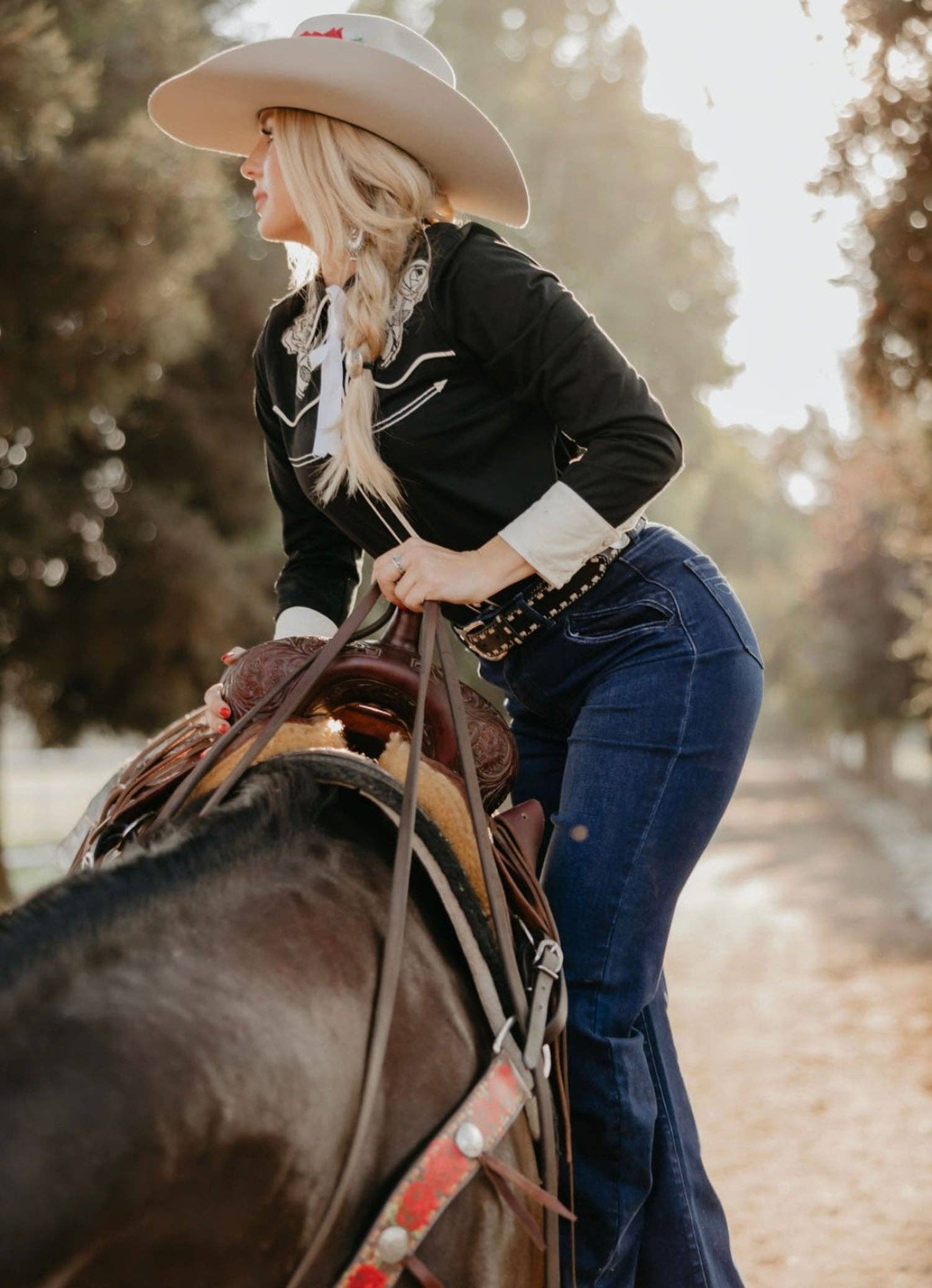The cowgirl’s life demands grit, style, and gear that can keep up — and that’s exactly what the Rodeo Quincy Ultimate Riding Jean was built for. Designed with a high rise and a 34” inseam, it gives that long, flattering silhouette every cowgirl wants. But the magic is in the fabric: ultimate stretch that feels like sweatpants yet never loses its shape. Whether you’re roping in the arena, climbing in the saddle, or hauling hay on the ranch, these jeans are made to flex with you — and still look flawless when the day is done. Fabric Content-92% Cotton 6% Polyester 2% Spandex